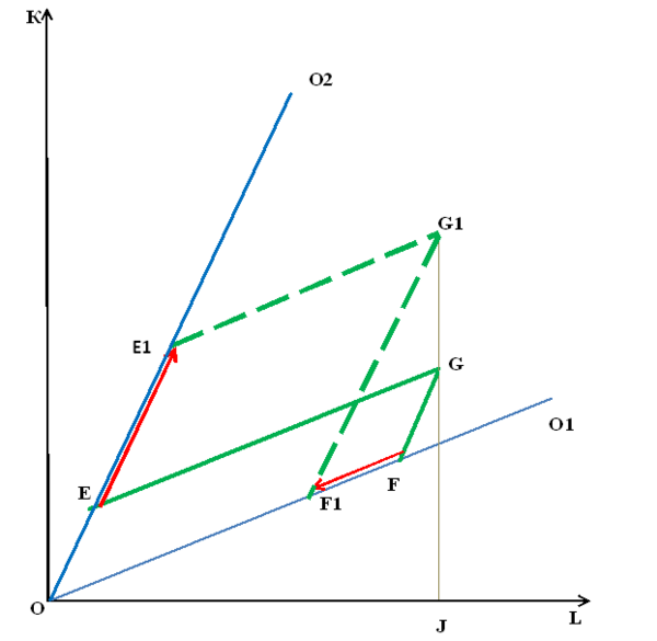 На графике «Влияние роста фактора на доходы от производства» товар 1 относительно более трудоемкий, а товар 2 относительно более капиталоемкий, тогда — технология (количество труда на единицу капитала) производства трудоемкого товара 1, а — технология производства капиталоемкого товара 2. Рассматриваемая страна обеспечена трудом в количестве и объёмом капитала , находясь в точке . Количество факторов производства трудоемкого товара 1 производится в объёме , а капиталоемкого товара 2 в объёме .