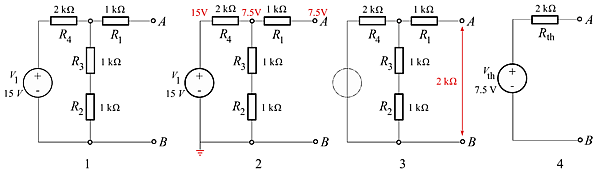 Вычисление эквивалентного напряжения (ЭДС) — напряжение, снимаемое с резистивного делителя напряжения состоящего из сопротивлений , так как рассчитывается режим холостого хода, ток через резистор и падение напряжения на нём нулевое:
