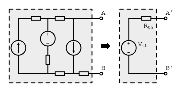 Иначе говоря, ток в любом сопротивлении , присоединенном к одной из выбранных цепей, равен току в этом же сопротивлении , присоединённом к идеальному источнику напряжения с напряжением, равным напряжению холостого хода цепи (напряжению на этих зажимах когда к ним ничего не подключено) и обладающим внутренним сопротивлением , равным полному сопротивлению внешней цепи, определённому со стороны зажимов при условии, что все источники внутри цепи заменены полными сопротивлениями, равными внутренним полным сопротивлениям этих источников.