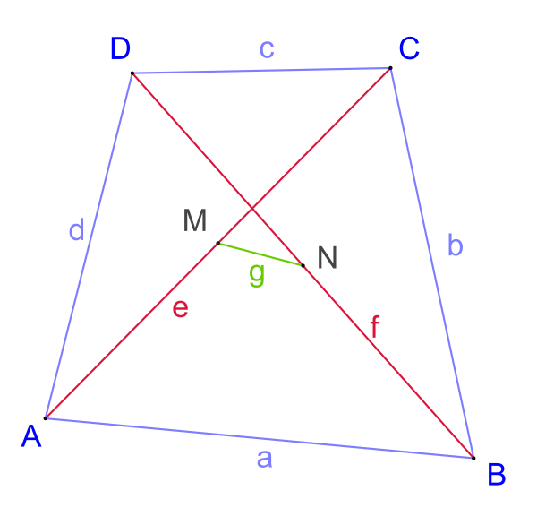 Для выпуклого четырёхугольника со сторонами и диагоналями и , середины которых соединены отрезком , выполняется равенство:
