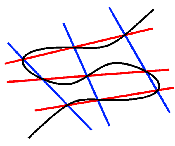 Если 8 из 9 точек пересечения двух троек прямых (на рисунке справа — синих и красных) лежат на кубике (кривой третьего порядка, чёрной), то девятая тоже лежит на ней.