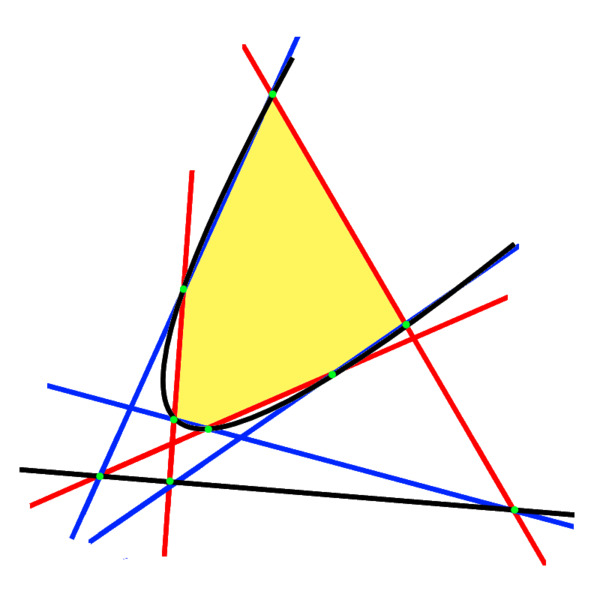 На рисунке справа шестиугольник с 3 красными и 3 синими сторонами вписан в чёрную параболу. Красные и синие прямые пересекаются в 9 зелёных точках, 6 из которых лежат на параболе, а через 2 другие проведена чёрная прямая. Поскольку чёрная кубика, содержит 8 зелёных точек, образованных пересечением красной и синей кубик, она содержит и девятую точку. Но эта точка не лежит на параболе, а значит она принадлежит прямой. ■