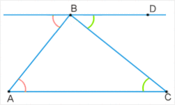 Пусть — произвольный треугольник. Проведём через вершину B прямую, параллельную прямой AC. Отметим на ней точку D так, чтобы точки A и D лежали по разные стороны от прямой BC. Углы DBC и ACB равны как внутренние накрест лежащие, образованные секущей BC с параллельными прямыми AC и BD. Поэтому сумма углов треугольника при вершинах B и С равна углу ABD. Сумма всех трёх углов треугольника равна сумме углов ABD и BAC. Так как эти углы внутренние односторонние для параллельных AC и BD при секущей AB, то их сумма равна 180°. Что и требовалось доказать.