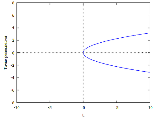 где — варьируемый параметр[6]. Равновесные решения уравнения определены только для ; при равновесные состояния отсутствуют. Значение является бифуркационным. На рисунке изображена соответствующая бифуркационная диаграмма. Как видно из рисунка, из точки бифуркации выходят две ветви равновесных состояний, одна из которых устойчивая, а вторая — неустойчивая. При варьировании параметра в сторону увеличения значений «из ничего» рождаются два состояния равновесия, одно из которых устойчиво. Бифуркации такого рода относят к типу «седло-узел».