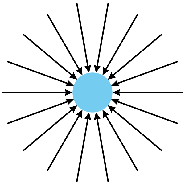 Пирамида Фатио (Проблема I)[9]: Фатио предположил, что вселенная наполнена мельчайшими корпускулами, которые движутся с очень высокой скоростью беспорядочно и прямолинейно во всех направлениях. Чтобы проиллюстрировать свои мысли, он использовал следующий пример: Вообразим объект С, на котором расположена бесконечно маленькая плоскость zz и нарисована сфера с центром в zz. В эту сферу Фатио поместил пирамиду PzzQ, в которой некоторые корпускулы движутся в направлении zz, а также некоторые корпускулы, которые уже были отражены объектом C и, следовательно, покидают плоскость zz. Фатио предположил, что средняя скорость отражённых частиц меньше, и следовательно импульс слабее, чем у падающих на тело корпускул. В результате получается один поток, который толкает все тела по направлению к zz. Таким образом, с одной стороны скорость потока остаётся постоянной, но с другой стороны при большей близости к zz плотность потока увеличивается и следовательно его интенсивность пропорциональна 1/r2. А так как можно нарисовать бесконечное количество таких пирамид вокруг C, пропорциональность 1/r2 приложима ко всей области вокруг C.