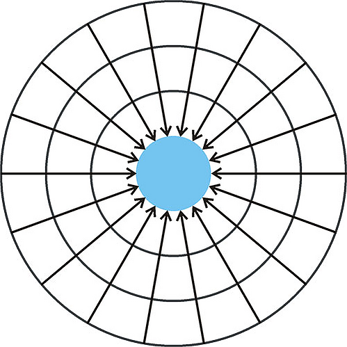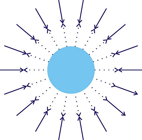 Из нашего предположения, что некоторые (или все) гравитационные частицы, сходящиеся на объекте, абсорбируются или замедляются данным объектом, следует, что интенсивность потока гравитационных частиц, испускаемого от массивного объекта, меньше, чем интенсивность потока, падающего на данный объект. Можно предположить, что этот дисбаланс импульса потока и соответственно силы приложенной на любое тело вблизи объекта распределён по сферической поверхности с центром на данном объекте (P4). Дисбаланс импульса потока над всей сферической поверхностью, окружающей объект, не зависит от размера окружающей сферы, в то же время площадь поверхности сферы увеличивается пропорционально квадрату радиуса. Следовательно, дисбаланс импульса на единицу площади уменьшается в обратно-квадратичной зависимости от расстояния.