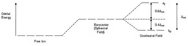 Самый распространённый вид координации лигандов — октаэдрическая, при которой шесть лигандов создают кристаллическое поле октаэдрической симметрии вокруг иона металла. При октаэдрическом окружении иона металла с одним электроном на внешней оболочке d-орбитали разделяются на две группы с разностью энергетических уровней Δокт (энергия расщепления), при этом энергия у орбиталей dxy, dxz и dyz будет ниже, чем у dz2 и dx2-y2, так как орбитали первой группы находятся дальше от лигандов и испытывают меньшее отталкивание. Три орбитали с низкой энергией обозначаются как t2g, а две с высокой — как eg.