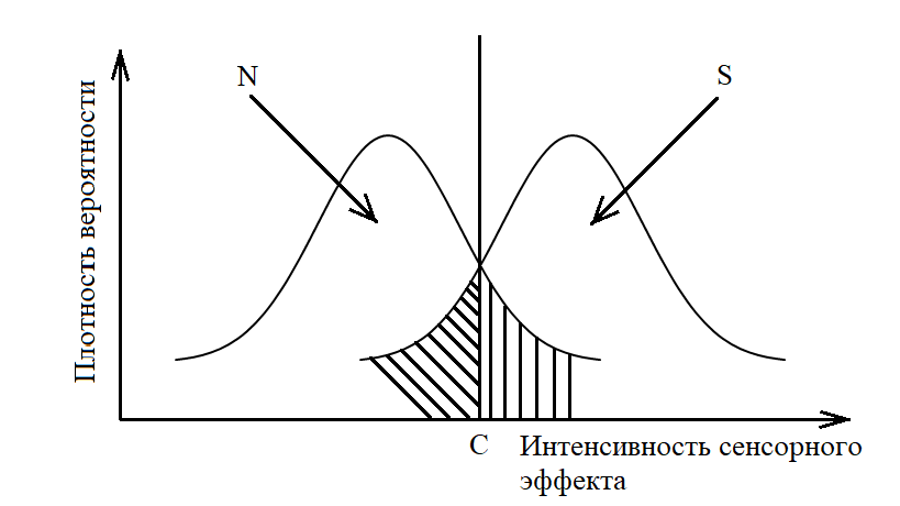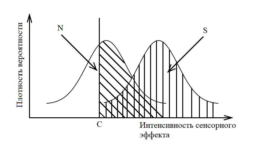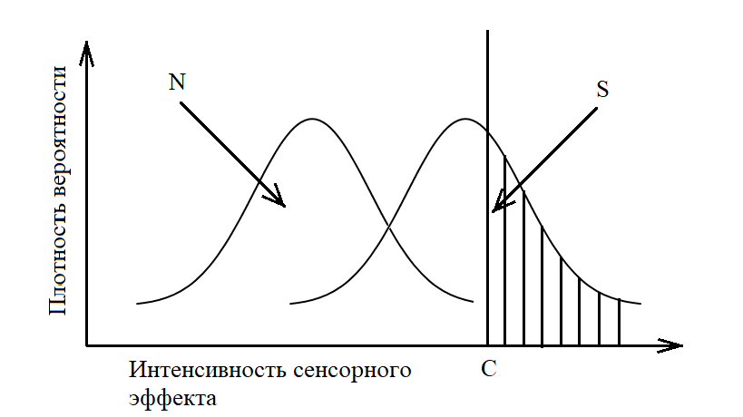- Либеральный — критерий сдвинут в сторону кривой шума. Выбор такого критерия обусловлен желанием не пропустить стимул. Количество правильных попаданий и ложных тревог при такой стратегии увеличивается.