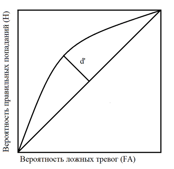 - Наблюдатель с пониженной чувствительностью — кривые сигнала и шума значительно перекрываются. Кривая РХ находится близко к диагонали квадрата