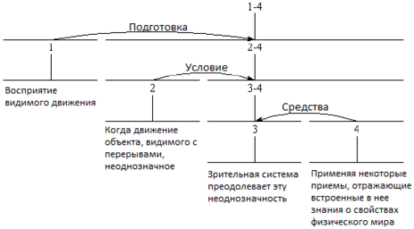 На иллюстрации номера 1, 2, 3, 4 обозначают текстовые блоки. Четвёртый и третий блоки формируют отношение «Средство», при этом четвёртый блок является ядром, а третий — спутником. Аналогично, второй блок по отношению к третьему и четвёртому формирует отношение «Состояние». Все части являются интервалами, причём интервалы могут содержать более одной текстовой единицы.