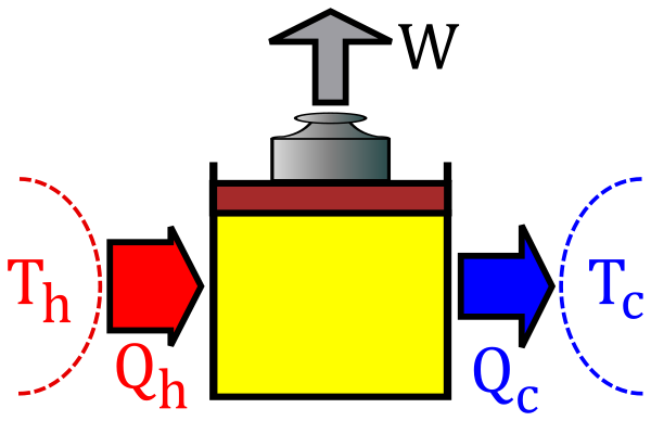 Часть теплоты при передаче неизбежно теряется, поэтому КПД двигателя менее 1. Максимально возможным КПД обладает двигатель Карно. КПД двигателя Карно зависит только от абсолютных температур нагревателя() и холодильника():