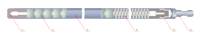 Устройство твэла реактора РБМК: 1 — заглушка; 2 — таблетки диоксида урана; 3 — оболочка из циркония; 4 — пружина; 5 — втулка; 6 — наконечник.