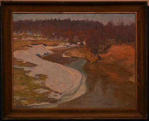 На картине изображён весенний пейзаж с извилистой речкой на переднем плане. По берегам видны пожухлая трава, первая зелень, островки снега, а также деревья и кусты. На заднем плане проходит полоса леса, над которым раскинулось светлое небо. Работа выполнена в преобладающих охристо-оливковых, сиренево-голубых и светло-коричневых оттенках, что формирует характерную цветовую гамму весеннего пейзажа.