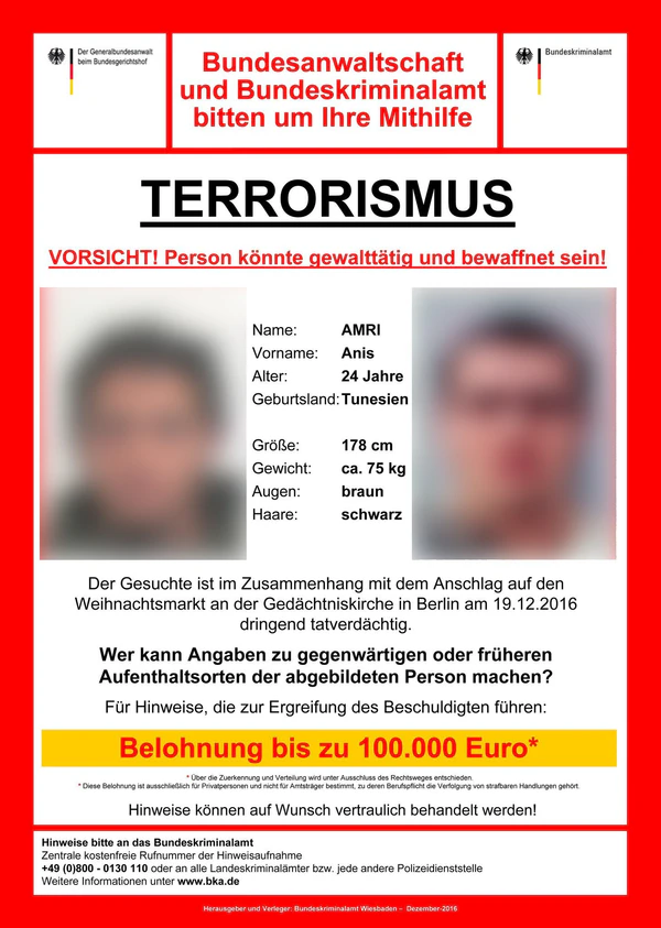 - Terroristischer Anschlag auf Weihnachtsmarkt: Fahndung nach Anis Amri (нем.). Bundeskriminalamt (23 декабря 2016). Дата обращения: 1 января 2017.