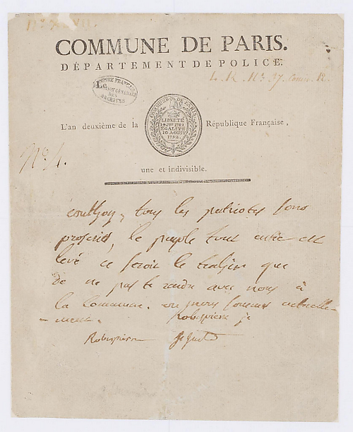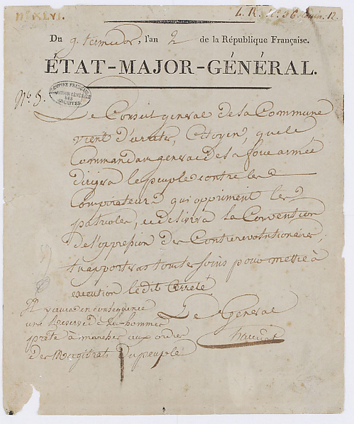 В свою очередь Коммуна декретировала арест заговорщиков, членов Конвента, Колло, Амара, Бурдона, Фрерона, Тальена, Паниса, Карно, Дюбуа, Вадье, Жавога, дю Баррана, Фуше, Гране, Бейля[пр 8]. Но секции колеблются: неясность обстановки, непонимание происходящего — знание лиц с обеих сторон добавляло к всеобщей сумятице. Так Леонар Бурдон, посланный в секцию Гравилье за национальной гвардией в помощь Конвенту, смог преодолеть неопределённость только после того, как объявил, что Робеспьер тайно подписал брачный контракт с дочерью Людовика XVI[48]. А одна из наиболее революционно настроенных секций Сен-Антуанского предместья, секция Кенз-Вен, участвовавшая во всех предыдущих восстаниях[пр 9], прислала ответ на призыв Коммуны: