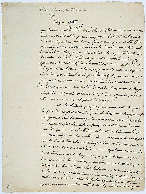 Скажем, следовательно, что против свободы общества существует заговор; что своей силой он обязан преступной коалиции, интригующей в самом Конвенте; что эта коалиция имеет сообщников в Комитете общественной безопасности и во всех бюро этого Комитета, где они господствуют; что враги республики противопоставили этот Комитет Комитету общественного спасения и таким образом установили два правительства; что в этот заговор входят члены Комитета общественного спасения; что созданная таким образом коалиция стремится погубить патриотов и родину. Как исцелить это зло? Наказать изменников, обновить все бюро Комитета общественной безопасности, очистить этот Комитет и подчинить его Комитету общественного спасения; очистить и самый Комитет общественного спасения, установить единство правительства под верховной властью Национального конвента, являющегося центром и судьёй, и таким образом под давлением национальной власти сокрушить все клики и воздвигнуть на их развалинах мощь справедливости и свободы: таковы принципы. Я создан, чтобы бороться с преступлением, а не руководить им. Ещё не наступило время, когда порядочные люди могут безнаказанно служить родине; до тех пор, пока банда мошенников господствует, защитники свободы будут лишь изгнанниками.[37]
