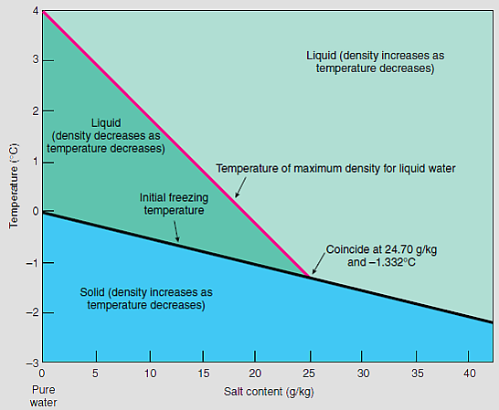 В 1920-х годах концепция Сандстрёма была расширена за счёт учёта роли солёности в формировании слоя океана.[3] Солёность важна, потому что, как и температура, она влияет на плотность воды. Вода становится менее плотной по мере повышения температуры и увеличения расстояния между её молекулами, но более плотной по мере увеличения солёности, поскольку в этой воде растворено большее количество солей.[5]Кроме того, в то время как пресная вода наиболее плотна при температуре 4 °C, морская вода становится только плотнее по мере охлаждения, пока не достигнет точки замерзания. Эта точка замерзания также ниже, чем для пресной воды, из-за солёности и может быть ниже −2 °C, в зависимости от солёности и давления.[6]