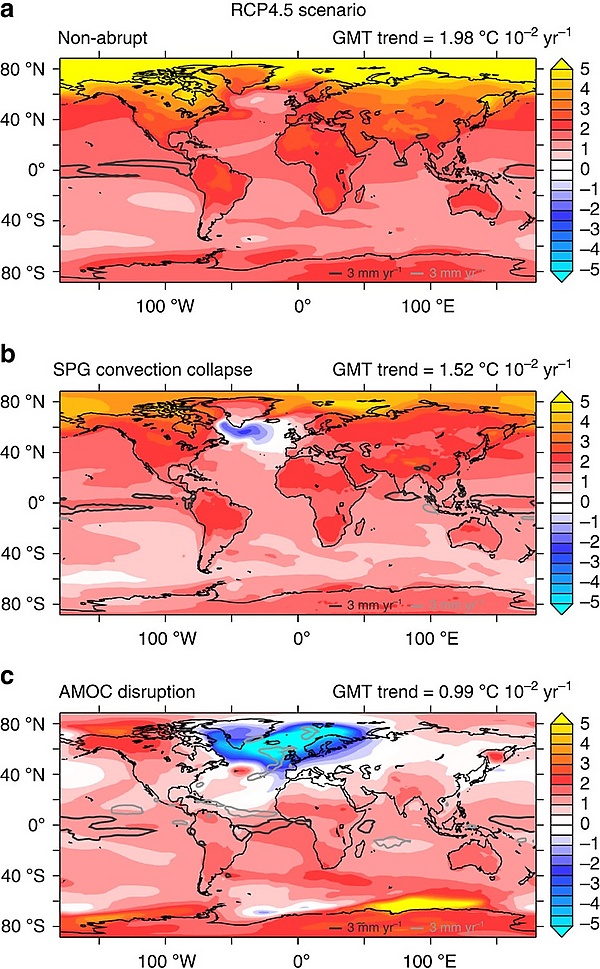 По состоянию на 2024 год нет единого мнения о том, произошло ли последовательное замедление циркуляции Атлантической меридиональной опрокидывающий циркуляции, но нет никаких сомнений в том, что это произойдёт в случае продолжающегося изменения климата. По данным МГЭИК, наиболее вероятными последствиями будущего снижения Атлантической опрокидывающей циркуляции являются уменьшение осадков в средних широтах, изменение характера сильных осадков в тропиках и Европе, а также усиление штормов, которые следуют по пути Северной Атлантики. В 2020 году исследование показало, что ослабление Атлантической меридиональной опрокидывающий циркуляции замедлит сокращение морского льда в Арктике. и приводят к атмосферным тенденциям, подобным тем, которые, вероятно, имели место во время позднего дриаса, таким как смещение на юг межтропической зоны конвергенции. Изменения в осадках при сценариях с высоким уровнем выбросов будут гораздо более значительными.