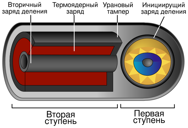 Термоядерная бомба, действующая по принципу Теллера — Улама, состоит из двух ступеней: активатора и контейнера с термоядерным горючим.