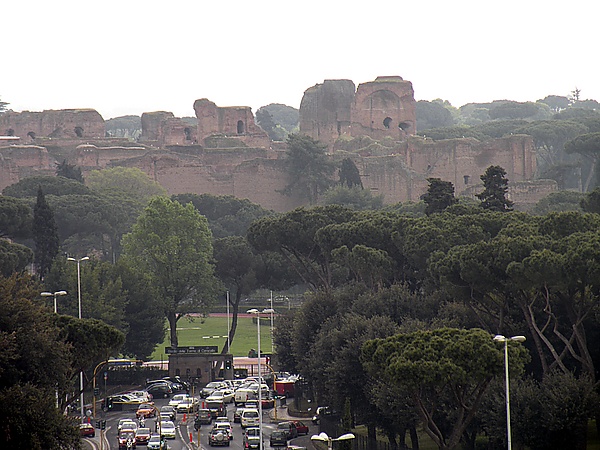 Уже в V в. н. э. Термы Каракаллы считались одним из чудес Рима. Они занимали площадь в 11 га. Главное здание, «банный корпус», лежит в парке, который окружён сплошной линией разных помещений. В бронзовые переплёты огромных полукруглых окон главного зала вставлены тонкие пластинки из полупрозрачного камня цвета слоновой кости. Из-за этого зал освещён ровным золотистым светом. Стены из полированного мрамора словно растворялись в высоте, где парил невиданной величины свод. Снаружи термы Каракаллы были облицованы мраморными плитами, под мрамором — многометровая толща местного камня и бетона — смеси извести с галькой и песком. Из кирпича или тёсаных камней римляне выкладывали как бы скорлупу здания. В неё заливалась бетонная масса. 3атвердевая, бетон становился крепче камня. Многие здания, которые кажутся сложенными из отдельных плит, в действительности состоят из одного отвердевшего бетонного «куска». Справа и слева от главного входа устроены две большие экседры; перед каждой из них палестра. В задней части сада (напротив главного входа), в правом и в левом углах, две просторные залы; судя по их внутреннему оборудованию, их следует считать библиотеками; с трёх сторон вдоль стен шли низенькие приступки, по которым поднимались к нишам, где хранились свитки. В центре между этими залами расположены амфитеатром ряды сидений; ряды эти несколько закругляются к обоим концам. Перед ними — стадион, смотреть на который можно было и из самих терм (из задних комнат), и с этого амфитеатра. Над ним повыше находились цистерны с водой для терм: 64 сводчатых помещения, шедших в два ряда и в два этажа. Вода для этих цистерн была отведена из Аква Марция.