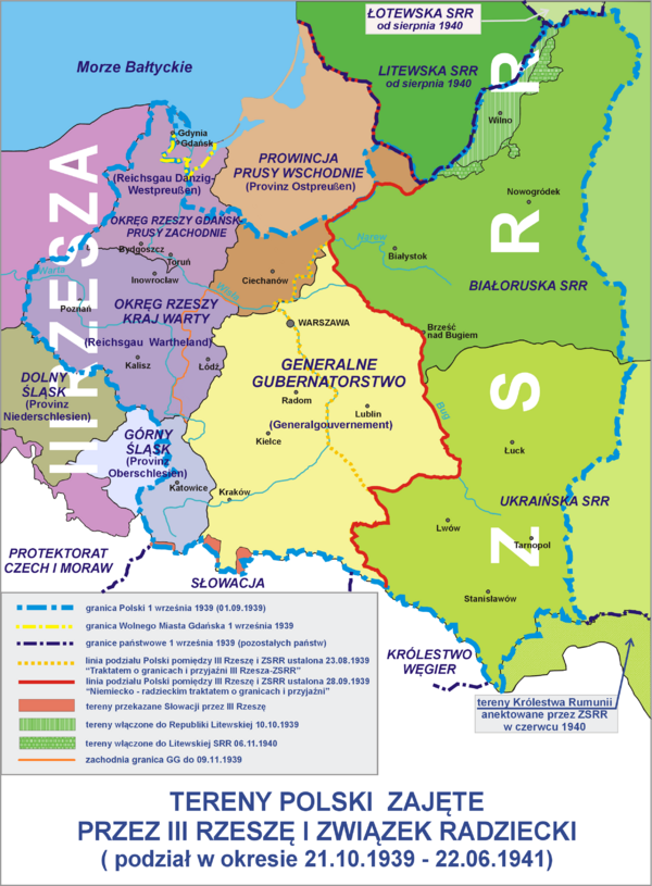 - 8 октября 1939 года особым декретом Гитлер учреждает в западных областях бывшей Польши и Данциге два новых рейхсгау: Позен (Познань-Позен, Лодзь-Лицманштадт) и Западная Пруссия (основная часть Померании, Гданьск-Данциг). Остальные земли вошли в уже существовавшие прусские провинции Верхняя Силезия (Катовице-Каттовиц и др.) и Восточная Пруссия (Цеханув-Цихенау, позже — и Белосток), а также созданное 26 октября образование с особым подчинённым статусом, не вошедшее в Рейх, — Генерал-губернаторство (Варшава, Краков, Люблин, Радом, позже — и Львов-Лемберг). Небольшие приграничные территории были отданы Словакии. 29 января 1940 года рейхсгау Позен переименовывается в Вартеланд, а Западная Пруссия — в Рейхсгау Данциг — Западная Пруссия.
