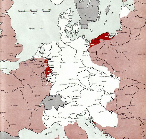- Германия лишается всех своих приобретений, включая Судетскую область, Эльзас-Лотарингию, Австрию, западные области Польши, Чехословакию, Бельгию, Люксембург и др. Восточной границей Германии устанавливается линия Одер — Нейсе (таким образом территория Германии по сравнению с 1937 годом сокращается примерно на 25 %).