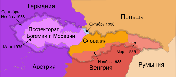 26 октября 1938 года Словакия и Подкарпатская Русь получили статус автономий в составе Чехословакии.- 2 ноября 1938 года — первый Венский арбитраж. По решению Германии и Италии населённые преимущественно этническими венграми южные районы Словакии и юго-западные районы Подкарпатской Руси были переданы Венгрии. С 20 ноября венгерские войска постепенно оккупируют эти земли.