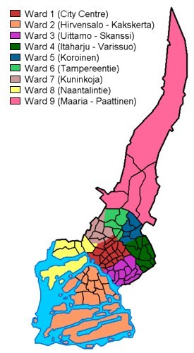 На данный момент в Турку 9 округов объединяющих 134 городских районов.