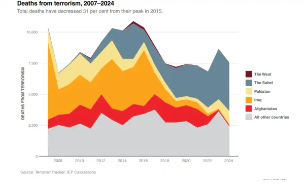 Согласно «Global terrorism index», к 2022 году количество погибших от атак террористических группировок в мире сократилось, составив 6 701 человек. При этом террористические атаки стали более смертоносными — каждое нападение приводило к гибели 1,7 человек[17]. По данным этой же организации, в 2024 году террористические атаки были зафиксированы в 66 странах, а число смертей увеличилось до 8352 человека. При этом четыре наиболее «смертоносные» террористические группировки усилили свою активность. Больше всего жертв терроризма было в Буркина-Фасо, Пакистане и Сирии. в странах Запада же преобладали нападения «волков-одиночек», на долю которых за предыдущие пять лет пришлось 93 % терактов со смертельным исходом[18].