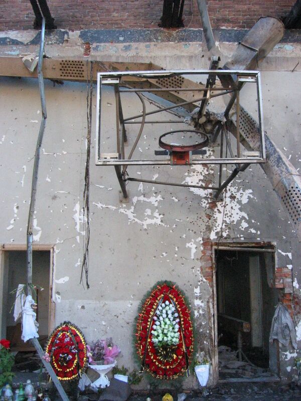 До начала работ спортзал был единственным местом, частично ремонтировавшимся после теракта: над крышей был натянут пластиковый купол, а стены укреплены стальными балками[320]. Посреди зала был установлен деревянный православный крест, а стены по периметру были обклеены фотографиями погибших[320]. Возле креста и вдоль стен зала лежали цветы и детские игрушки, а также стояли церковные свечи и открытые бутылки с водой[103].