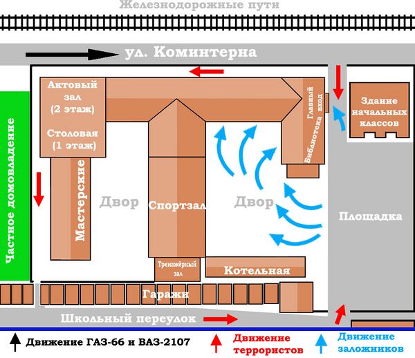 Однако у СОШ № 1, как у объекта захвата, существовал и ряд отрицательных сторон: школа находилась на расстоянии приблизительно 80 метров от здания УВД, а форма двора и близлежащие здания ограничивали видимость для державших оборону. Наконец, само расположение здания школы в центре Беслана создавало дополнительный риск провала диверсионной группы во время приближения к объекту. Учитывая также тот факт, что другие бесланские школы по совокупности факторов были не менее уязвимы для нападения[57], доподлинная причина, по которой террористы выбрали СОШ № 1, неизвестна или не обнародована следствием.