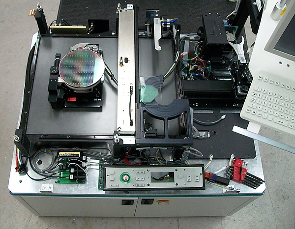 Тестировщик полупроводниковых пластин осуществляет испытание и разбраковку чипов на линии скрайбирования пластины. Некоторые компании получают большую часть информации о производительности устройств по результатам этих испытаний. [2]