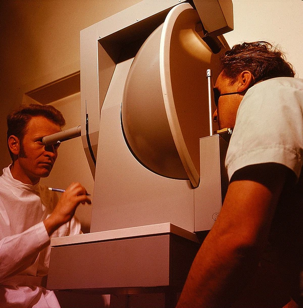 Периметр Гольдмана представляет собой полую белую полусферу, расположенную перед пациентом. Экзаменатор использует световое пятно различного размера, цвета[5] и интенсивности, перемещая его от периферии к центру (кинетическая периметрия), или предъявляя локально, поочередно в разных местах (статическая периметрия). Метод Гольдмана информативен в оценке всего поля зрения и активно использовался в течение многих лет[6]. На смену данному методу пришла автоматизированная периметрия.