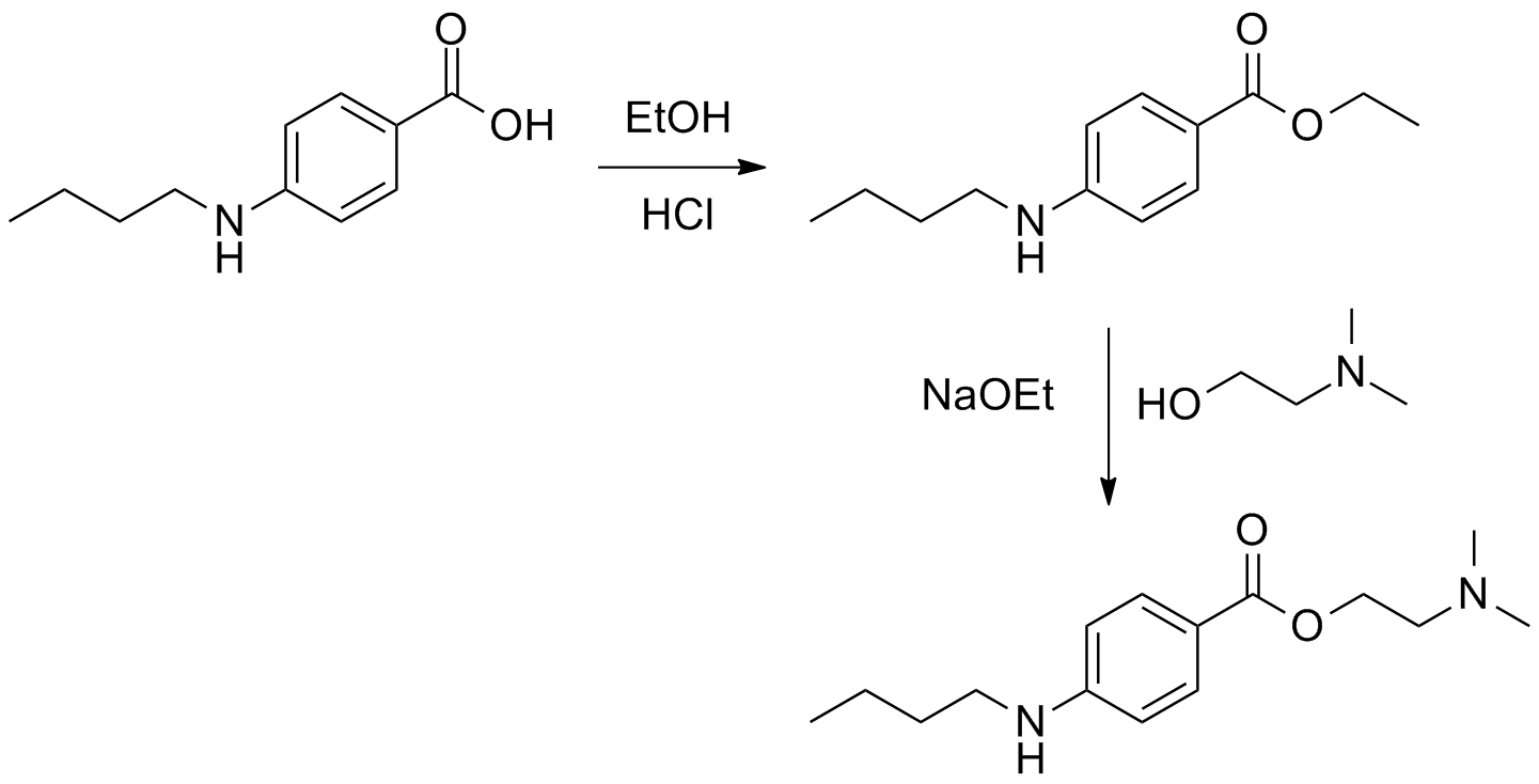 Тетракаин синтезируют из 4-бутиламинобензойной кислоты. На первой стадии проводится реакция этерификации в кислой среде под действием этанола. На следующей стадии в условиях щелочного катализа небольшими количествами этилата натрия осуществляется переэтерификация этилового эфира 4-бутиламинобензойной кислоты при кипячении с избытком 2-диметиламиноэтанола[2].