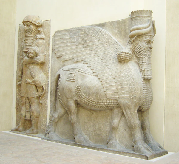 При раскопках ассиро-халдейских городов были найдены колоссы быков и львов, имевших человеческие головы, а порой и две пары крыльев (два из которых опущены, что соответствует описанию Иезекииля — Иез. 1:9).[29] Эти фигуры устанавливались при входах в храм и выступали в роли кариатид, поддерживающих своды (ср. с Иезекиилем, рассказывающем о своде, лежащем над головами животных — Иез. 1:22). Русский богослов, профессор М. Н. Скабалланович сообщает, что известен рисунок на шумерском каменном цилиндре, изображающий бородатого бога, чей престол поддерживают четыре таких крылатых быка.[30]