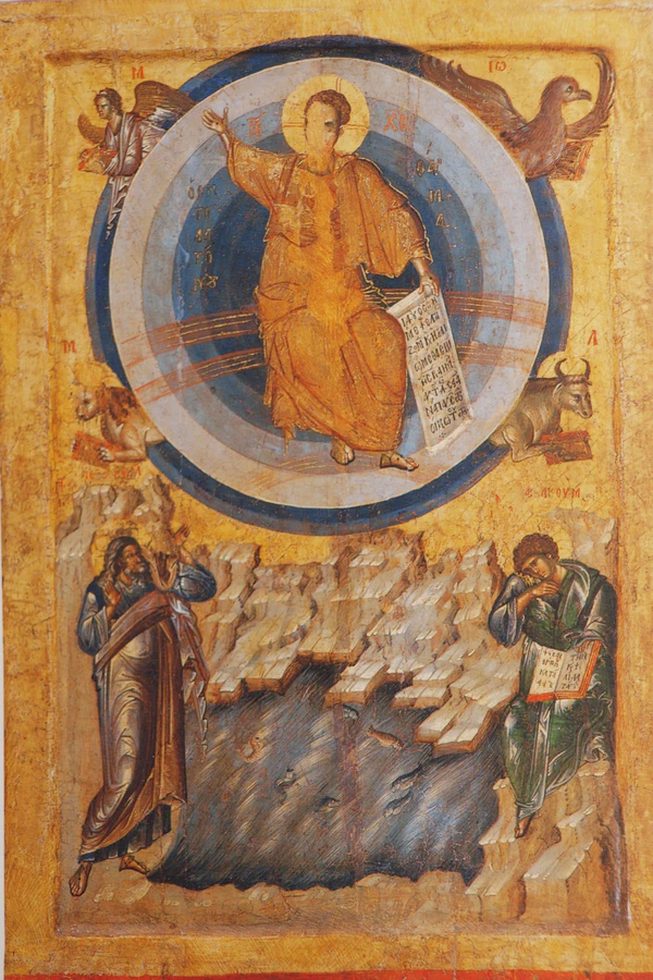 Первая версия: Впервые во II веке Ириней Лионский, толкуя Апокалипсис, предложил трактовку связи евангелистов и существ из видения Иоанна Богослова: лев у Иринея символизирует Иоанна Богослова, телец — Луку, человек — Матфея, орёл — Марка. Так же считали Анастасий Синаит, Арефа Кесарийский, Феофилакт Болгарский[12] и некоторые другие богословы. Эта традиция была сохранена на христианском Востоке в малоазийских церквях.[13] Ириней растолковывает, что именно символизирует каждое из существ, и подытоживает, что справедливо, что на них восседает Иисус Христос.