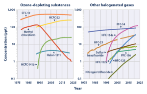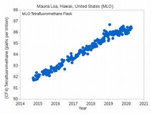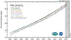 - ↑ Jubb, Aaron M.; McGillen, Max R.; Portmann, Robert W.; Daniel, John S.; Burkholder, James B. (2015). “An atmospheric photochemical source of the persistent greenhouse gas CF4”. Geophysical Research Letters. 42 (21): 9505—9511. Bibcode:2015GeoRL..42.9505J. DOI:10.1002/2015GL066193. ISSN 0094-8276.