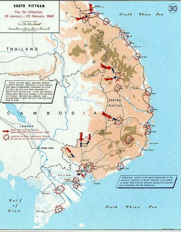 Тетское наступление началось в ночь на 31 января. По всему Южному Вьетнаму подверглись обстрелам американские базы, а ряд городов был атакован силами НФОЮВ. Северовьетнамская армия почти полностью заняла город Хюэ и объявила об установлении там «народной власти». В Сайгоне атакам партизан подвергся ряд ключевых объектов, включая Дворец Республики, штаб южновьетнамской армии и американское посольство.