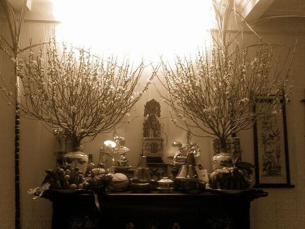 Во вьетнамских семьях обычно имеется алтарь предков, и на Тет его чистят, обновляют подношения (в том числе «пять фруктов»). По поверьям, три хранителя домашнего очага, онг-тао (вьетн. Ông Táo), отчитывающиеся перед Нефритовым императором Нгок Де о событиях в доме, возвращаются на небо в 23-й день 12-го лунного месяца, и их уход отмечают скромной церемонией, сопровождающейся ритуальными жертвами.