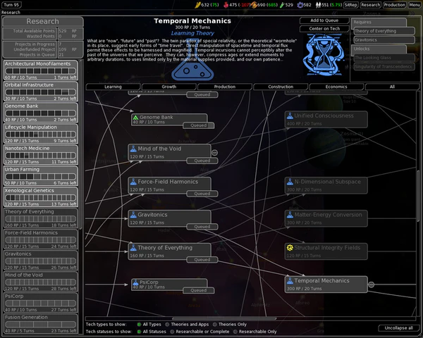 Одна из форм игрового процесса, в качестве которой рассматривают технологии, — это «исследование нефизического мира». Так как человек существо любопытное, ему интересно открывать новые территории как перемещаясь по игровому миру, так и делая то же самое в виртуальном пространстве технологического древа[8].