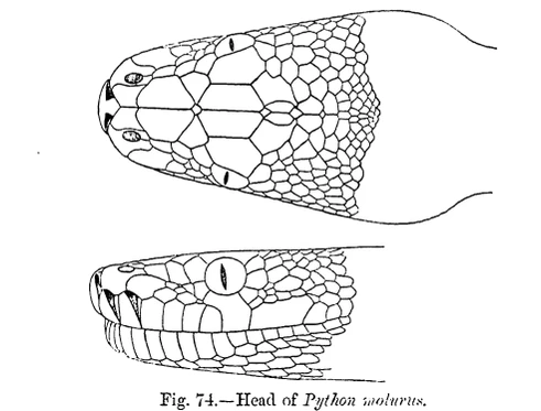 - по щиткованию головы. У светлого тигрового питона шестой верхнегубной щиток касается глаза, в то время как у темного тигрового питона шестой верхнегубной щиток отделен от глаза подглазничным;