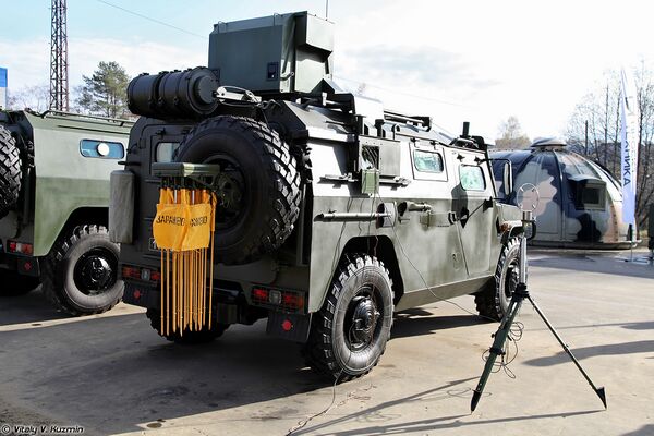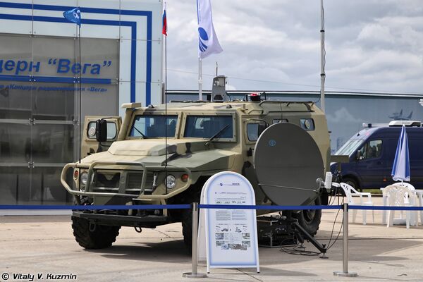Мобильный автоматизированный комплекс радиоэлектронной борьбы «Леер-2» на шасси АМН 233114 от ВПК и ВНИИ „Эталон“. Комплекс позволяет ставить радиопомехи, имитировать работу РЭС, анализировать электромагнитную обстановку на месте[27].