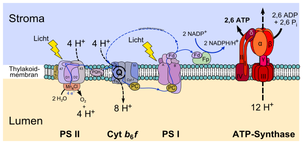 - Передача электрона от фотосистемы II к пластохинону во время светозависимой реакции фотосинтеза, входящей в нециклическую электронтранспортную цепь, потребляет два протона из стромы. Они переносятся в просвет тилакоида, когда восстановленный пластохинон окисляется цитохромным комплексом b6f на стороне тилакоидной мембраны, обращенной к просвету. От пластохинона электроны передаются цитохромному комплексу b6f, который напоминает цитохром bc1.