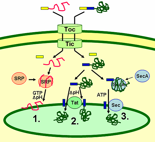 Некоторые другие белки интегрируются в мембрану при помощи механизма распознавания сигнальных пептидов. Хлоропластные белки-рецепторы могут распознавать целевые белки как после их трансляции, так и во время её, и таким образом они могут переносить как внешние белки, так и белки, транслируемые внутри хлоропласта. Этот механизм в качестве источников энергии использует ГТФ и градиент pH.