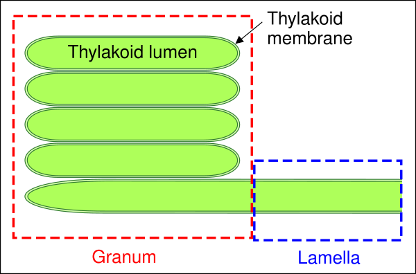 Граны — это стопки из тилакоидов, имеющих форму дисков. Хлоропласты могут содержать от 10 до 100 гран. Граны соединены строматическими тилакоидами, которые иногда называют также межграновыми тилакоидами, или ламеллами. Гранальные и агранальные тилакоиды различаются своим белковым составом.