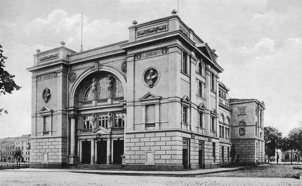 Театр открылся в специально приспособленном здании в 1893 году. Это здание обладало сравнительно небольшой вместительностью и было существенно перестроено и реконструировано в 1903 году. Зрительный зал был расширен, появилась оркестровая яма перед сценой. Сцена также была углублена и расширена. Театр был перестроен в стиле барокко. Реконструкция 1936 года проводилась с позиции нацистской идеологии, многие элементы декора внутри здания были убраны, снаружи здание было полностью перестроено. Здание приобрело более строгий вид, были убраны скульптуры Шиллера и Гёте.