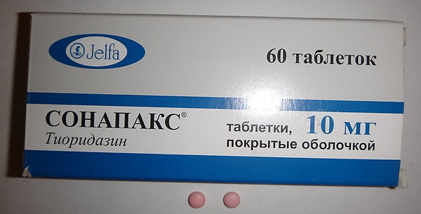 Тиоридази́н (Thioridazine) — антипсихотический препарат «сбалансированного» спектра, пиперидиновое производное фенотиазина[2]. Одни авторы относят этот препарат к типичным, другие — к атипичным антипсихотикам[3]. Каталептического действия почти не оказывает и значительно реже, чем другие фенотиазиновые препараты, вызывает экстрапирамидные расстройства. Одни из самых распространённых названий — «Тиодазин», «Сонапакс».