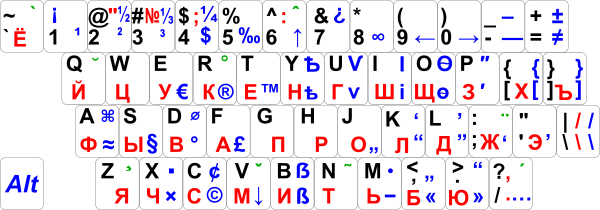 Ниже дана полная интерактивная карта типографских и дополнительных символов русской стандартной раскладки. Символы, отмеченные зелёным цветом, печатаются при зажатой клавише AltGr. Синие — при зажатых ⇧ Shift+AltGr. Если использовать AltGr+Пробел, то будет введён неразрывный пробел.