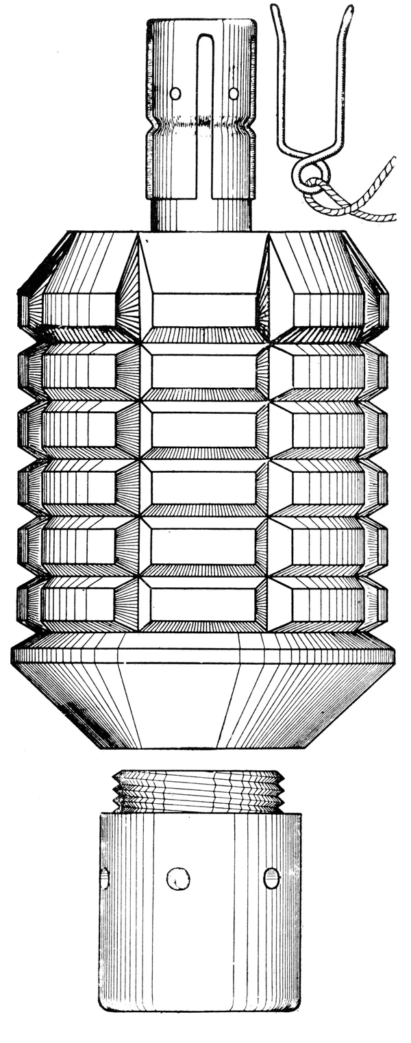Корпус цилиндрической формы изготовлен из чугуна с вертикальными и горизонтальными насечками и снаряжён зарядом взрывчатого вещества (тринитротолуола или тринитрофенола).