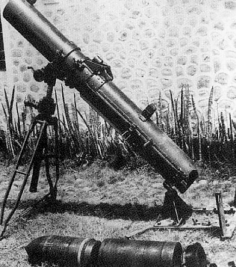 Внешне это оружие выглядело как обычный миномёт классической схемы («мнимый треугольник»), имея опорную плиту, двуногу, миномётный прицел и механизм горизонтирования. Отличие состояло в открытой с двух сторон гладкой трубе ствола (верхняя половина которой шарнирно откидывалась вверх для удобства заряжания турбореактивным (т.е устойчивость снаряду придавалась вращением снаряда вдоль продольной оси и вращение создавалось дополнительными наклонными соплами) снарядом калибра 200 мм с фугасной или химической — боеприпас с последней, впрочем, практического применения не получил — боевой частью) и применяемом боеприпасе (неуправляемая ракета, а не артиллерийская мина).
